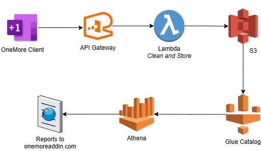 The OneMore client collects the data, serializes it as JSON, and POSTs to an API Gateway endpoint. This is sent on to a lambda where the packet schema and its data are validated and then stored in S3.